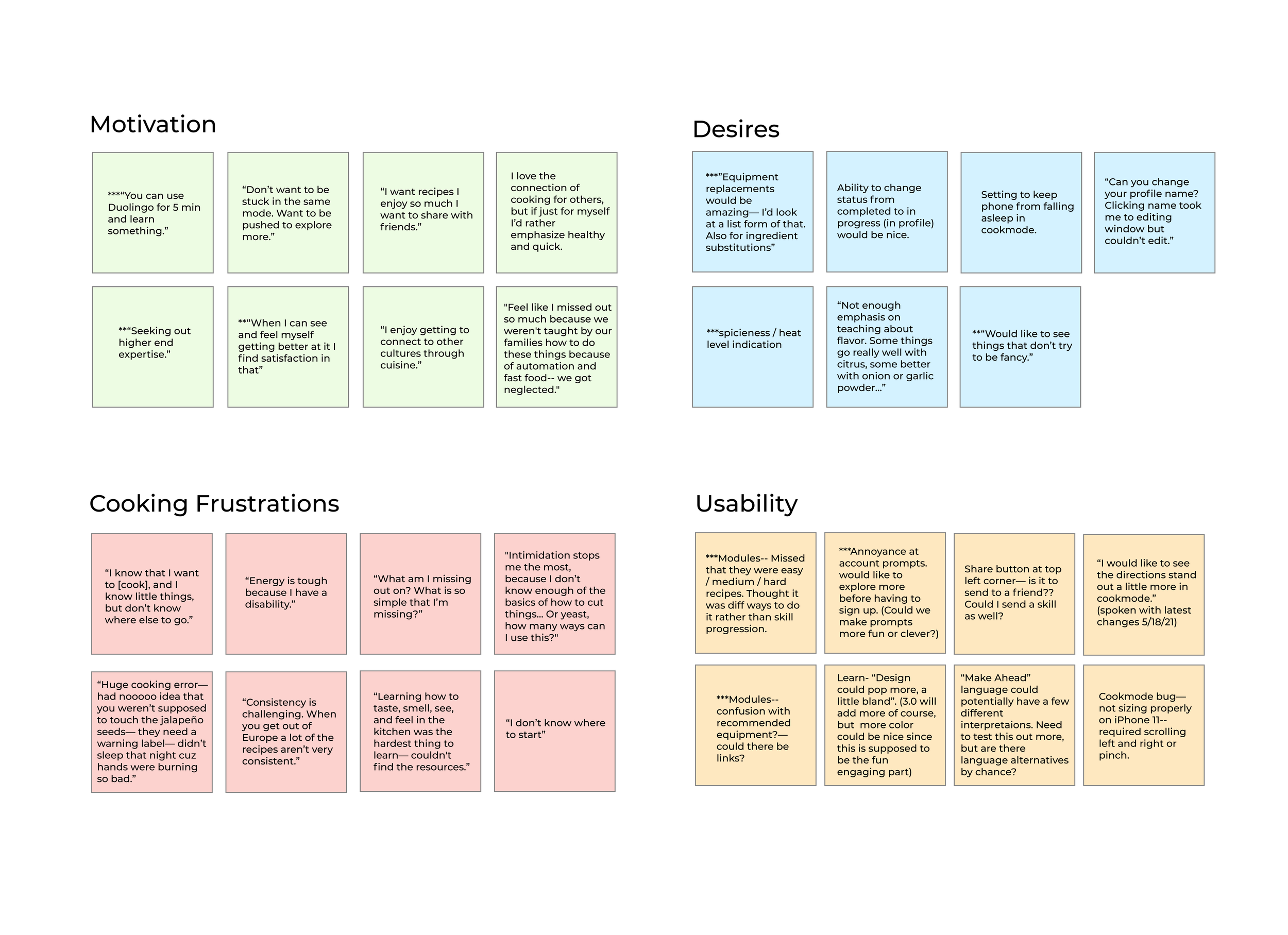I had many methods for analyzing the results I gathered from my research, including more detailed Excel spreadsheets with color-coded, categorized quotes from each interview. This Affinity Map was helpful for summarizing key insights and themes as I presented to the team. I also recorded Zoom interviews and edited select bites for certain key insights we were most interested in understanding.